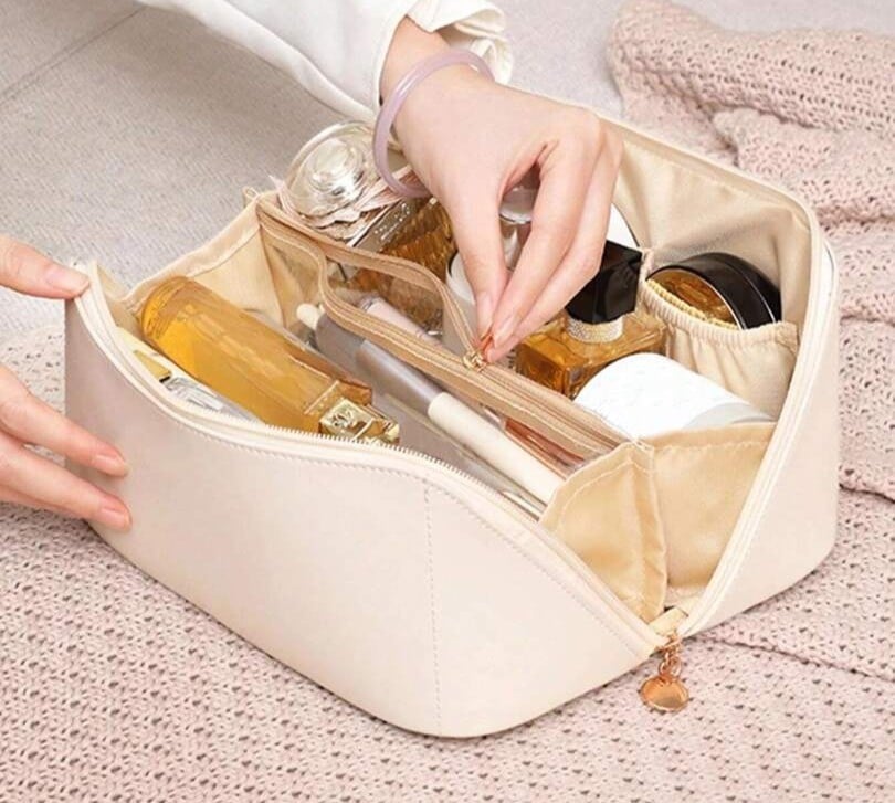 - تصميم واسع: بفضل سعتها الكبيرة، توفر هذه الحقيبة مساحة وفيرة لتخزين جميع مستحضرات التجميل ومنتجات الجمال الخاصة بك، مما يحافظ على تنظيمها وسهولة الوصول إليها.
